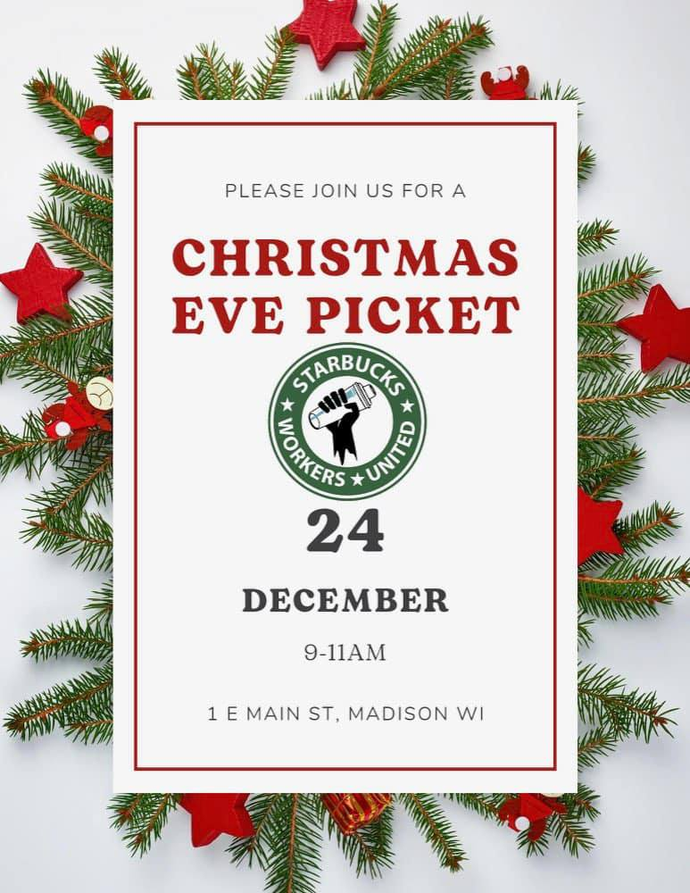 Categories Uncategorized Madison, December 24, 2025: Starbucks Workers United STRIKE Picket Post author By WiBOPM Post date December 23, 2025 SBWorkersUnited Share this: Click to share on X (Opens in new window) X Click to share on Facebook (Opens in new window) Facebook Like Loading... Related ← UE: For Jobs, Peace and a Pro-Worker Foreign Policy → LA Teachers Union: No Endorsements for Genocide Enablers
