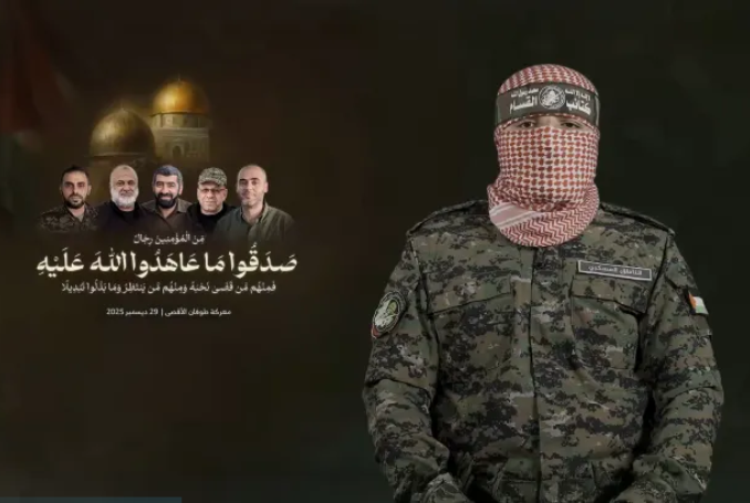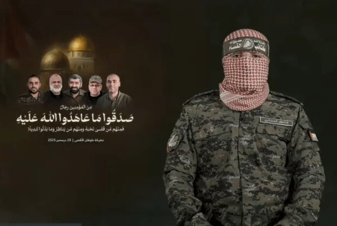 Categories Uncategorized ‘We Pledge to Continue the Path’: Full Speech by Newly Introduced Abu Obeida Post author By WiBOPM Post date December 31, 2025 https://www.palestinechronicle.com/we-pledge-to-continue-the-path-full-speech-by-newly-introduced-abu-obeida/ The newly-introduced spokesman of the Al-Qassam Brigades, Abu Obeida. (Photo: video grab) Share this: Click to share on X (Opens in new window) X Click to share on Facebook (Opens in new window) Facebook Like Loading... Related ← Milwaukee, January 8, 2026: Wisdom’s Uniting to Build Our Communities Forum