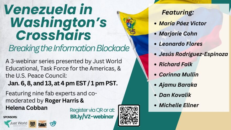Categories Uncategorized Webinar January 6, 2026: Venezuela in Washington’s Crosshairs – Breaking the Information Blockade Post author By WiBOPM Post date December 31, 2025 Sponsored by Just World Educational. All details and registration link here. Share this: Click to share on X (Opens in new window) X Click to share on Facebook (Opens in new window) Facebook Like Loading... Related ← The K-shaped economy is monopoly capitalism working as designed → Madison on Fridays 2026: Vigil in Support of Palestine