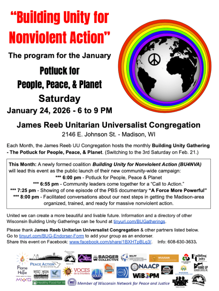 Madison, January 24, 2026: Potluck for People, Peace & Planet by Building Unity
