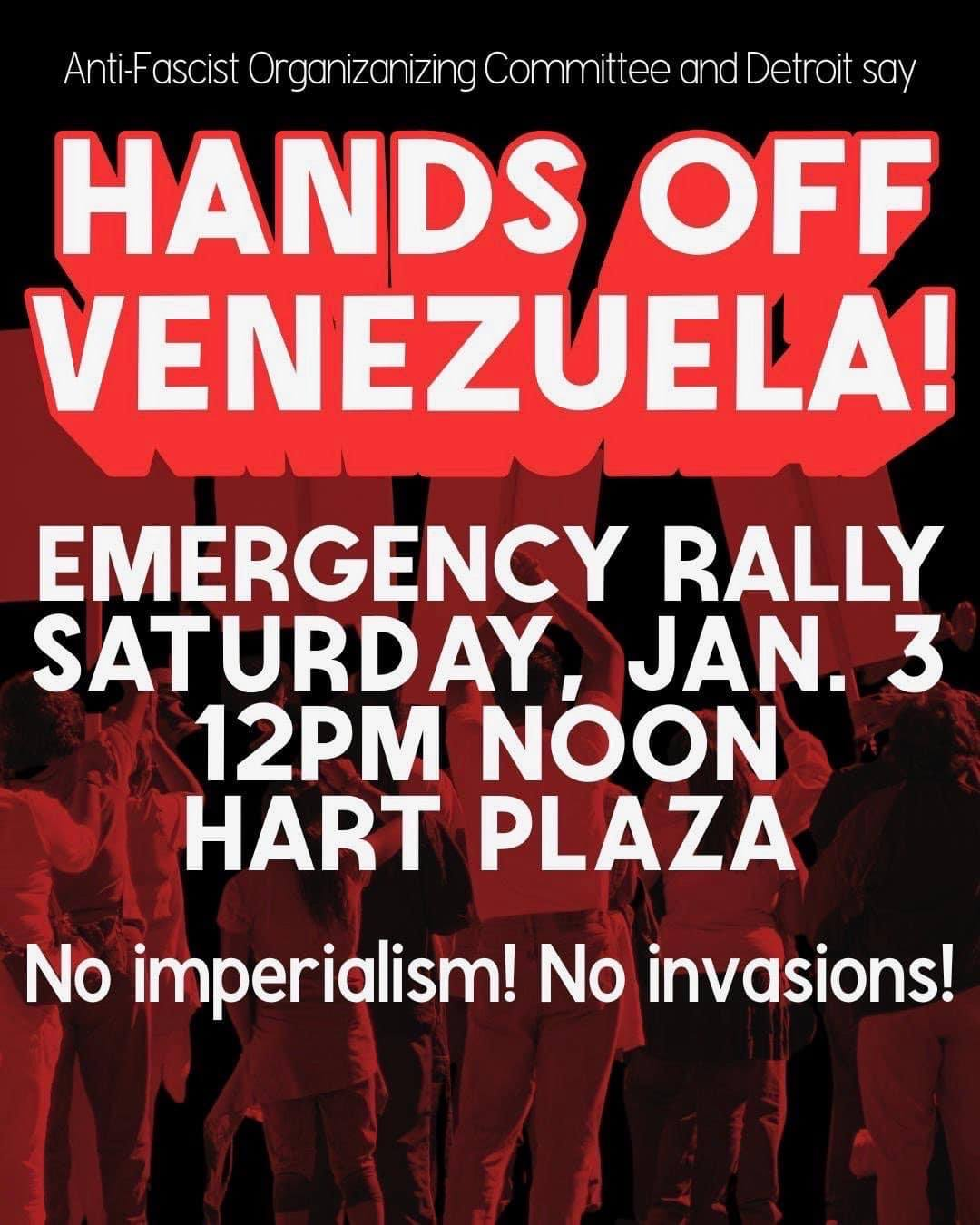 Categories Uncategorized Detroit, January 3, 2026: Hands Off Venezuela! No Imperialism! No Invasions! Post author By WiBOPM Post date January 3, 2026 Share this: Click to share on X (Opens in new window) X Click to share on Facebook (Opens in new window) Facebook Like Loading... Related ← teleSUR: Cubans Rally in Havana to Condemn U.S. Attack on Venezuela & Other Worldwide Protest Coverage → Madison Protest Demands: U.S. Hands Off Venezuela! Free Maduro! Money for People’s Needs Not Endless U.S. Wars! (Photos)