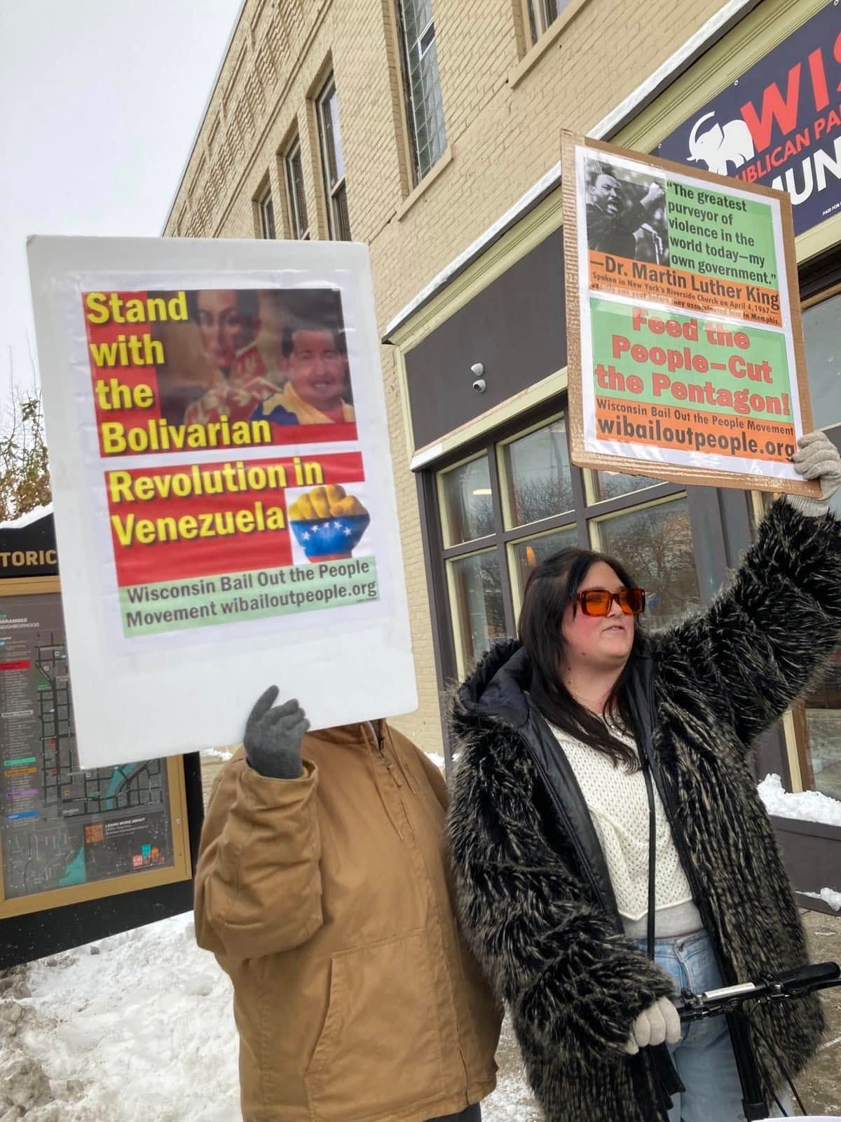 Categories Uncategorized Green Bay, WI January 4, 2026: No U.S. War On Venezula! Free Maduro! Post author By WiBOPM Post date January 3, 2026 1 P.M. Sunday, January 4, 2026 Corners of Webster and Main Streets, Green Bay, WI Milwaukee December 2025. / Photo: Wisconsin Bail Out The People Movement Share this: Click to share on X (Opens in new window) X Click to share on Facebook (Opens in new window) Facebook Like Loading... Related ← Emergency Milwaukee Protest January 3, 2026: No U.S. War On Venezuela! – Return President Maduro and Spouse → Madison, January 3, 2026: No U.S. War On Venezuela!