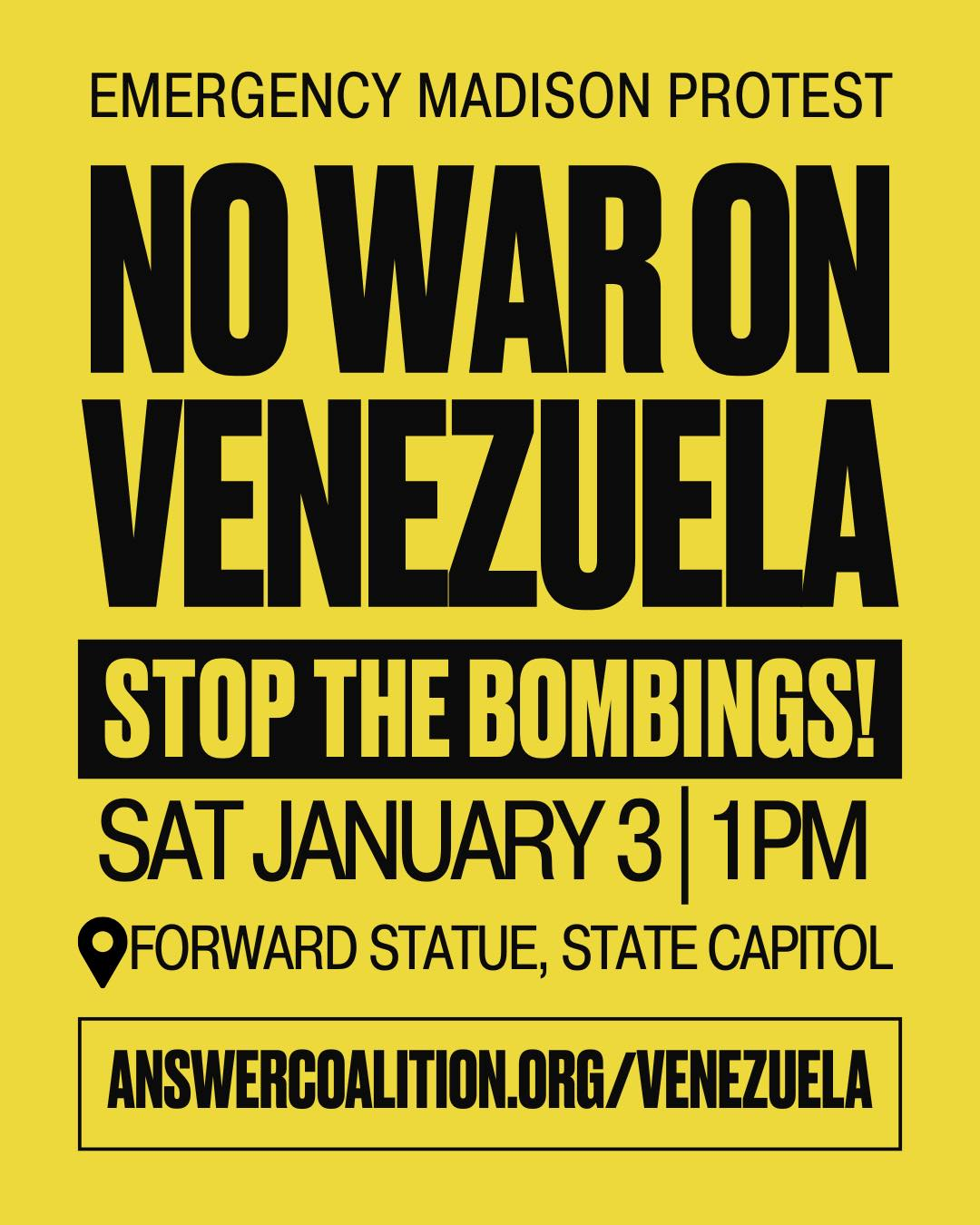 Categories Uncategorized Madison, January 3, 2026: No U.S. War On Venezuela! Post author By WiBOPM Post date January 3, 2026 Share this: Click to share on X (Opens in new window) X Click to share on Facebook (Opens in new window) Facebook Like Loading... Related ← Green Bay, WI January 4, 2026: No U.S. War On Venezula! Free Maduro! → The United States attacks Venezuela and kidnaps its president in an illegal operation