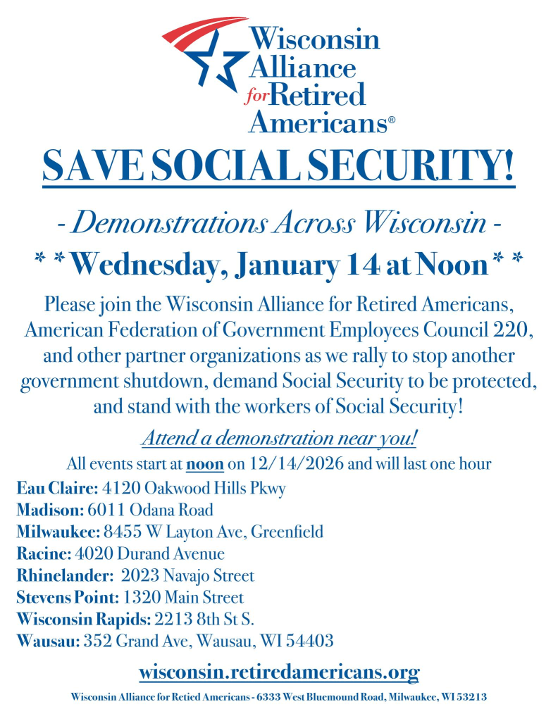 Categories Uncategorized Demonstrations Across Wisconsin January 14, 2026 – SAVE SOCIAL SECURITY! Post author By WiBOPM Post date January 6, 2026 Wisconsin Alliance for Retired Americans Share this: Click to share on X (Opens in new window) X Click to share on Facebook (Opens in new window) Facebook Like Loading... Related ← Join the January 25, 2026 International Online Rally to Stop the War on Venezuela → Milwaukee, January 8, 2026: ICE Raids in Wisconsin – Muslim Community Forum