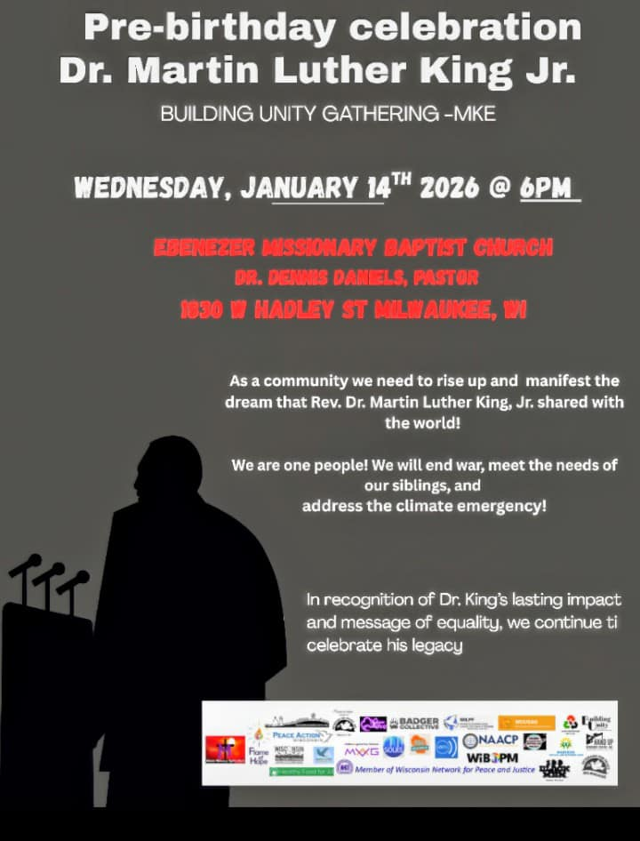 Categories Uncategorized Milwaukee, January 14, 2026: Pre Birthday Celebration Dr. Martin Luther King Jr. Post author By WiBOPM Post date January 9, 2026 Share this: Click to share on X (Opens in new window) X Click to share on Facebook (Opens in new window) Facebook Like Loading... Related ← Madison, January 9, 2026: ICE OUT! – Solidarity Vigil and Action! → Milwaukee, January 19, 2026: Dr. MLK Jr. Day – Unite Against Militarism, Racism and Poverty! – Program & March