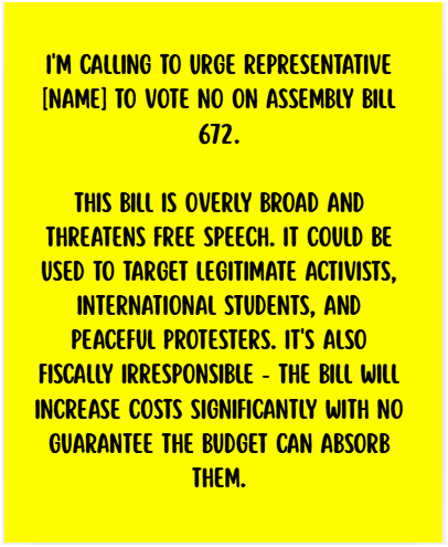 “Hi, my name is [YOUR NAME]. I’m calling to urge Representative [NAME] to vote NO on Assembly Bill 672.