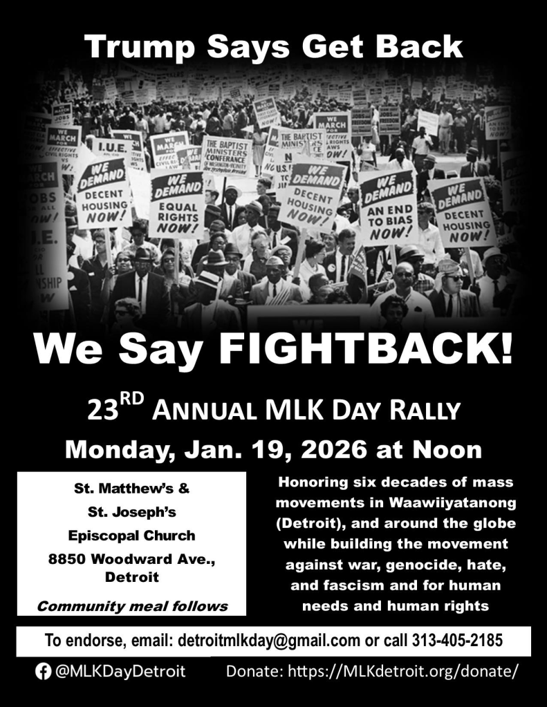 Categories Uncategorized Detroit, January 19, 2026, 23rd Annual MLK Rally – ‘Trump Says Get Back, We Say FIGHT BACK!’ Post author By WiBOPM Post date January 16, 2026 Moratorium NOW! Coalition Share this: Share on X (Opens in new window) X Share on Facebook (Opens in new window) Facebook Like Loading... Related ← Milwaukee, January 19, 2026: Dr. MLK Day Rally & March – Stop Poverty, Racism & War!