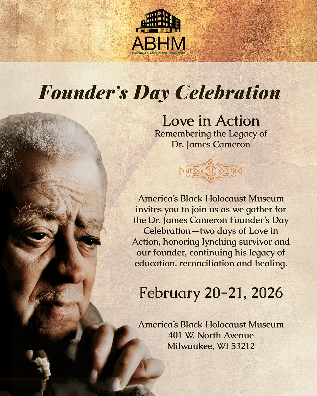 America’s Black Holocaust Museum invites you to join us for the 2026 Dr. James Cameron Founder’s Day Celebration.