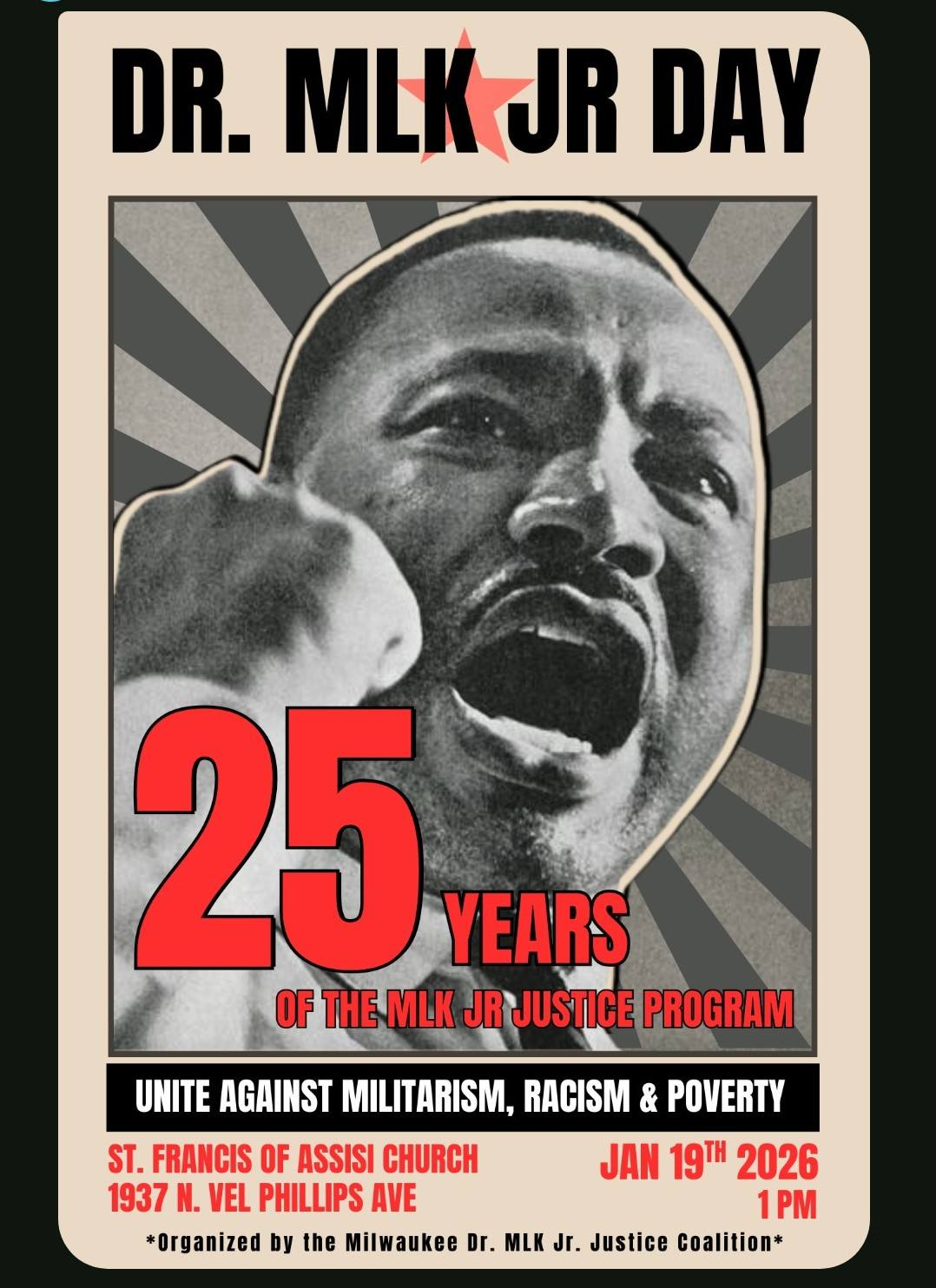 Categories Uncategorized Milwaukee, January 19, 2026: Dr. MLK Day Rally & March – Stop Poverty, Racism & War! Post author By WiBOPM Post date January 16, 2026 Share this: Share on X (Opens in new window) X Share on Facebook (Opens in new window) Facebook Like Loading... Related ← Milwaukee, Feb. 20-21, 2026: Founder’s Day Celebration Honoring Dr. James Cameron → Detroit, January 19, 2026, 23rd Annual MLK Rally – ‘Trump Says Get Back, We Say FIGHT BACK!’