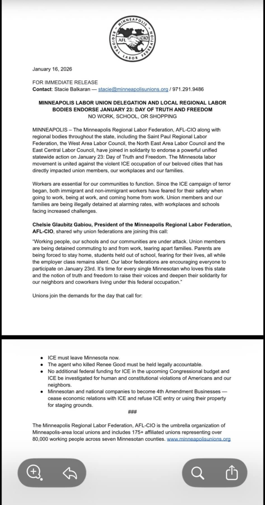 Categories Uncategorized Minneapolis Labor Union Delegation and Local Regional Labor Bodies Endorse January 23, 2026 ‘Day of Truth and Freedom’ – No Work, School or Shopping! Post author By WiBOPM Post date January 17, 2026 Minneapolis Regional Labor Federation https://minneapolisunions.org/ Share this: Share on X (Opens in new window) X Share on Facebook (Opens in new window) Facebook Like Loading... Related ← Kalaallit Nunaat (aka Greenland) vs. Trumpland: the fight for sovereignty in the geopolitical Arctic → Labor & Community Members Demand an End to 287g in Kenosha! – Stop ICE! Stop La Migra!