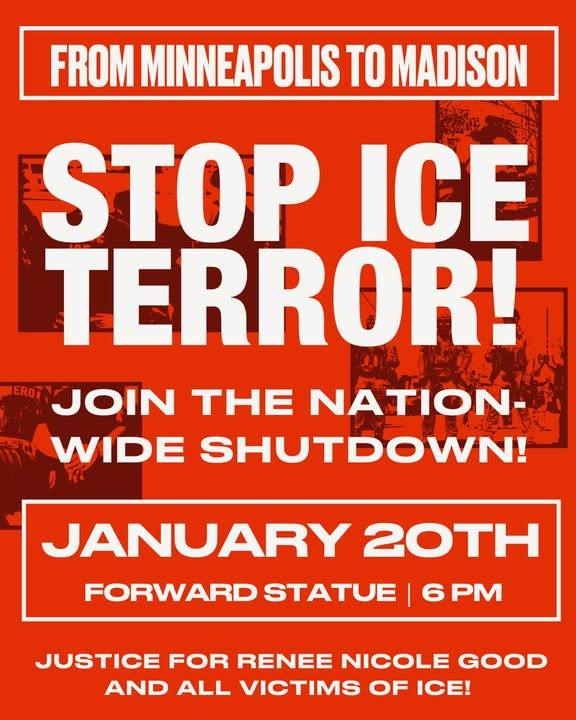 Categories Uncategorized Madison, January 20 and Milwaukee, January 23, 2026: Money for Healthcare NOT ICE! – Stop Endless U.S. Wars! (Rallies & Marches) Post author By WiBOPM Post date January 18, 2026 Share this: Share on X (Opens in new window) X Share on Facebook (Opens in new window) Facebook Like Loading... Related ← The siege of Minneapolis: testimonies from the front lines