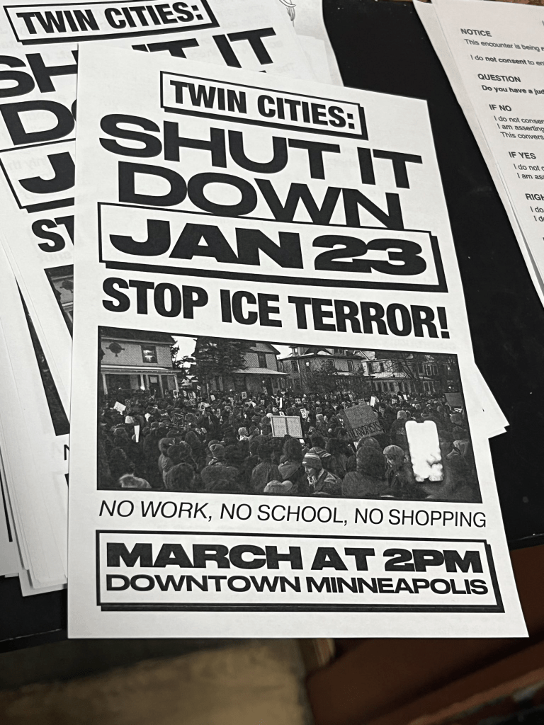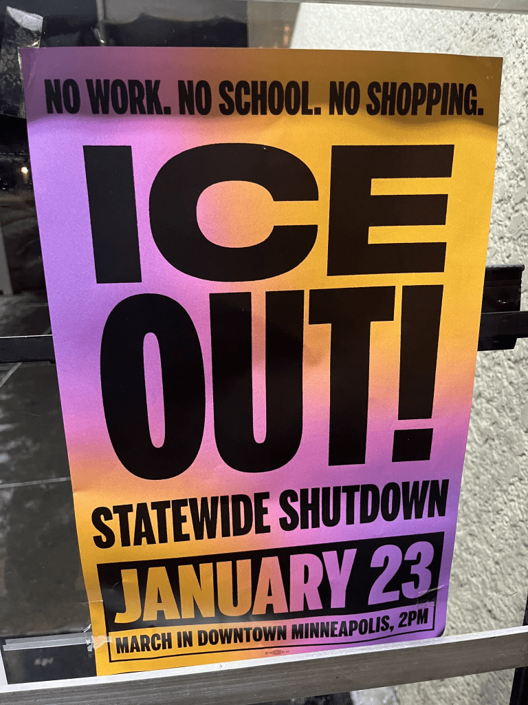 Categories Uncategorized ALL OUT FOR MINNEAPOLIS JANUARY 23, 2026! – ICE OUT! – SHUT IT DOWN! Post author By WiBOPM Post date January 20, 2026 Photo: Wisconsin Bail Out The People Movement in Minneapolis 1/19/26. Photo: Wisconsin Bail Out The People Movement in Minneapolis 1/19/26. Click to access press_release_-_january_16_2026.pdf https://www.commondreams.org/news/minneapolis-ice-general-strike https://paydayreport.com/minneapolis-afl-cio-calls-for-general-strike-on-friday-as-movement-spreads-to-other-cities/ Share this: Share on X (Opens in new window) X Share on Facebook (Opens in new window) Facebook Like Loading... Related ← 80 years without a general strike. Then ICE came to Minneapolis → Madison, Feb. 1, 2026: Anti-War Cafe!