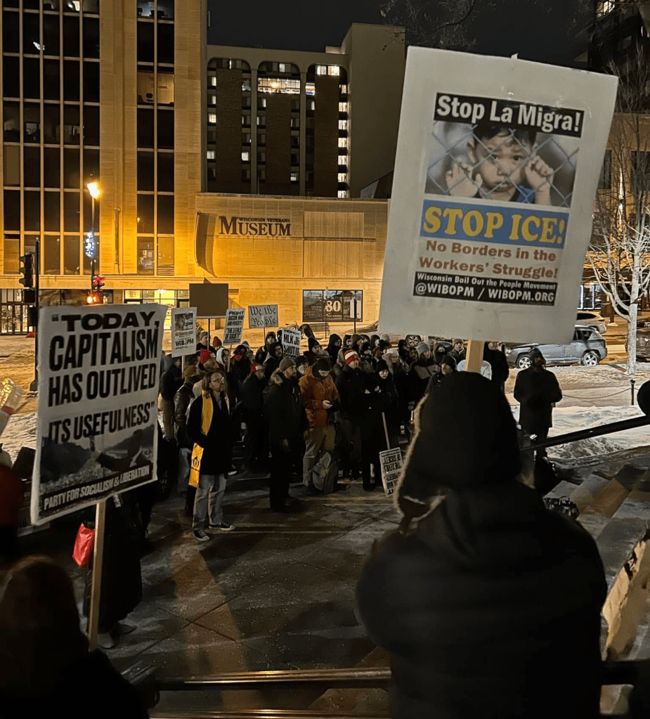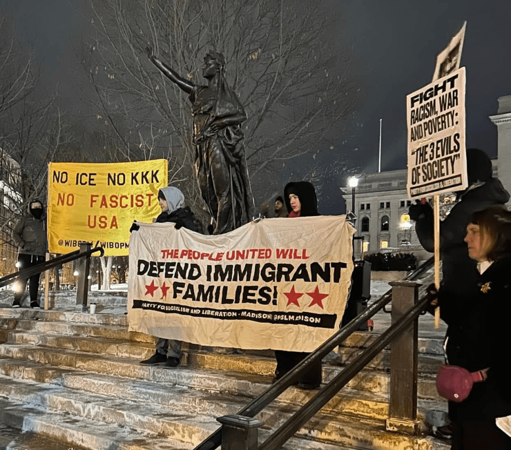 Categories Uncategorized Despite Freezing Cold, Labor and Community Members in Madison Demand ‘NO ICE!’ at Rally Post author By WiBOPM Post date January 20, 2026 Photos 1/20/26 at the State Capitol in Madison by: Wisconsin Bail Out The People Movement Share this: Share on X (Opens in new window) X Share on Facebook (Opens in new window) Facebook Like Loading... Related ← Madison, Feb. 1, 2026: Anti-War Cafe! → Detroit Solidarity With Minneapolis January 23, 2026: Strike and Fight for Immigrant Rights! – No Work. No School.NoShopping