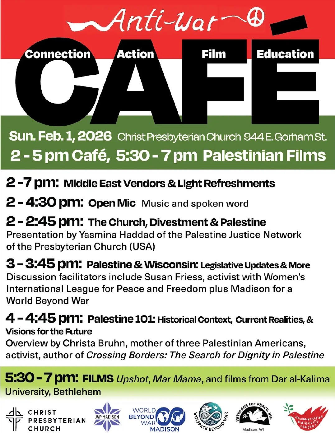 Categories Uncategorized Madison, Feb. 1, 2026: Anti-War Cafe! Post author By WiBOPM Post date January 20, 2026 Share this: Share on X (Opens in new window) X Share on Facebook (Opens in new window) Facebook Like Loading... Related ← ALL OUT FOR MINNEAPOLIS JANUARY 23, 2026! – ICE OUT! – SHUT IT DOWN!