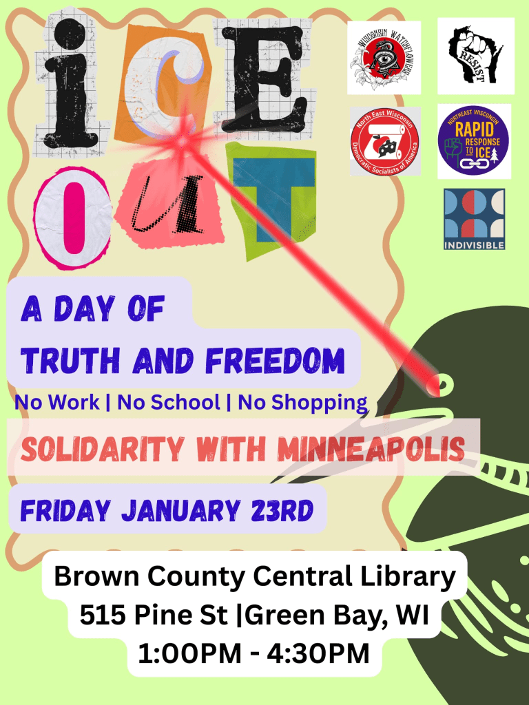Categories Uncategorized Green Bay, January 23, 2026: ICE Out Now! Solidarity With Minneapolis! Post author By WiBOPM Post date January 21, 2026 Share this: Share on X (Opens in new window) X Share on Facebook (Opens in new window) Facebook Like Loading... Related ← ‘Full Circle’: AIM patrols back on Minneapolis streets as tensions rise → Beaver Dam Stands With Minneapolis January 23, 2026! Stop ICE Terror!