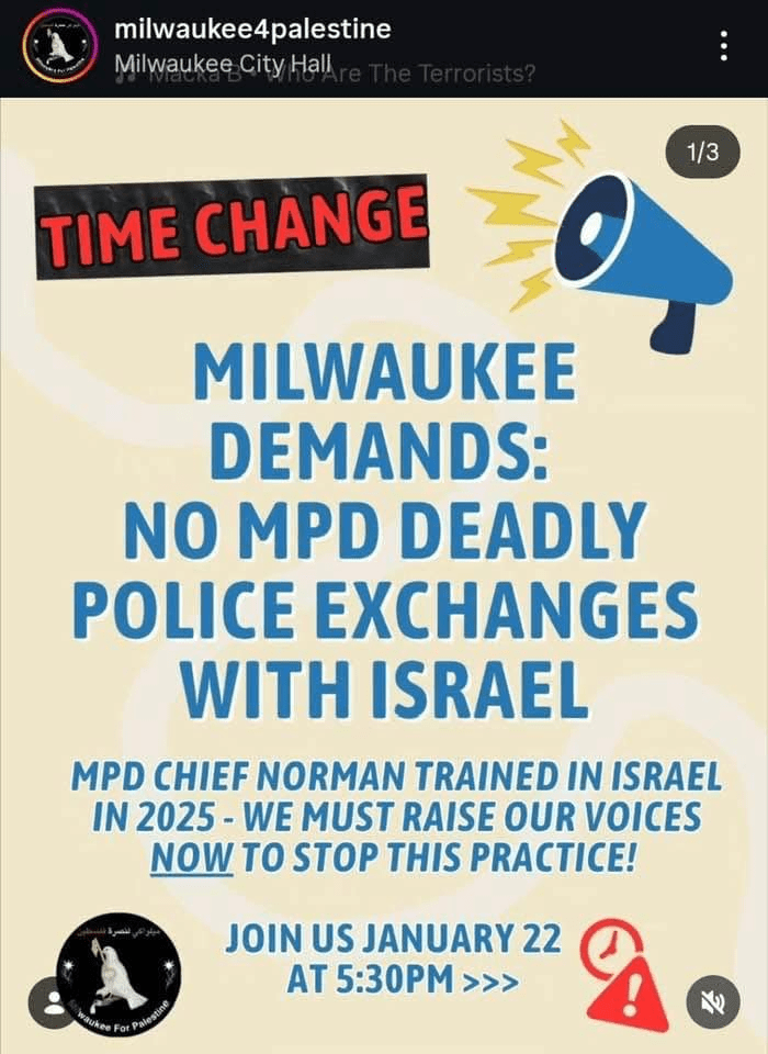 Categories Uncategorized Milwaukee Demands: No Deadly MPD Exchanges With Israel! – Pack Meeting at 5:30 P.M. January 22, 2026 Post author By WiBOPM Post date January 21, 2026 Share this: Share on X (Opens in new window) X Share on Facebook (Opens in new window) Facebook Like Loading... Related ← Call to Stop AB 672 in Wisconsin – Fight for Freedom of Speech & Democratic Rights! Contact Representatives NOW! → ‘Full Circle’: AIM patrols back on Minneapolis streets as tensions rise