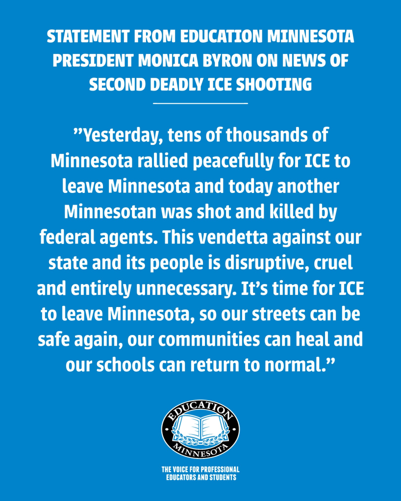Categories Uncategorized EDUCATION MINNESOTA Statement on Another Murder by ICE Agents Post author By WiBOPM Post date January 24, 2026 We’re calling on ICE to leave Minnesota after another deadly shooting. (Link to share: https://edmn.me/3ZwCIG6) Education Minnesota Share this: Share on X (Opens in new window) X Share on Facebook (Opens in new window) Facebook Like Loading... Related ← SHINE A LIGHT FOR MINNESOTA JANUARY 24, 2026 → Michael Parenti: Capitalism vs. Reality
