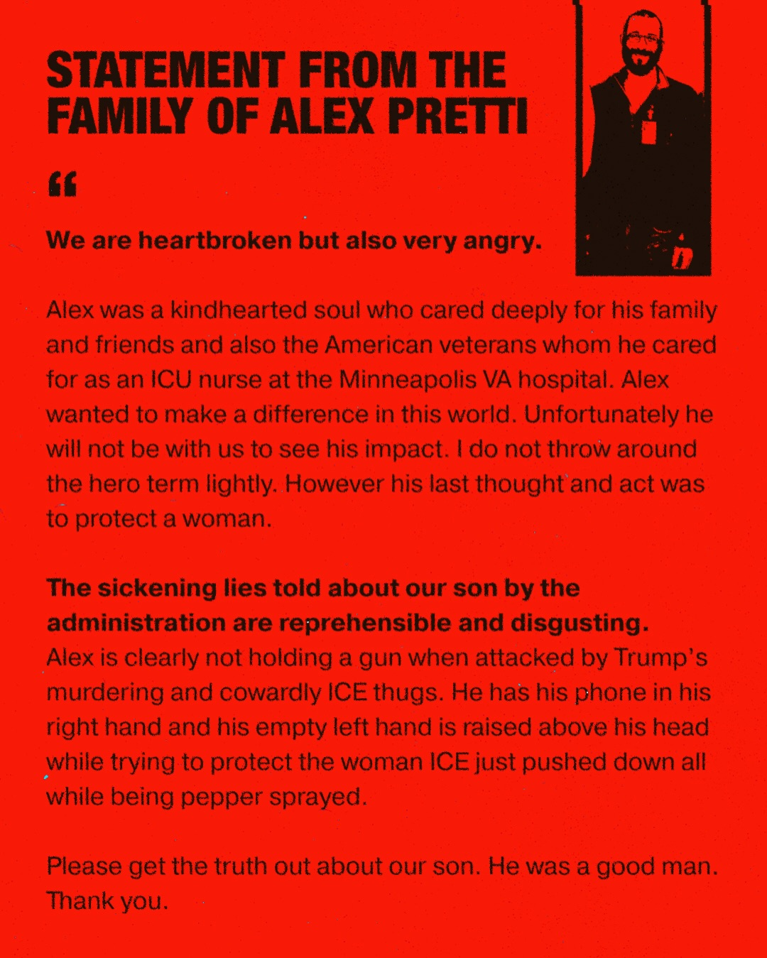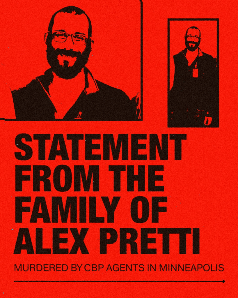 Categories Uncategorized Statement From the Family of Alex J. Pretti Post author By WiBOPM Post date January 24, 2026 Share this: Share on X (Opens in new window) X Share on Facebook (Opens in new window) Facebook Like Loading... Related ← Fond du Lac, WI, January 31, 2026: Worker & Community Assembly! – Stop ICE! – Reports From Minneapolis!