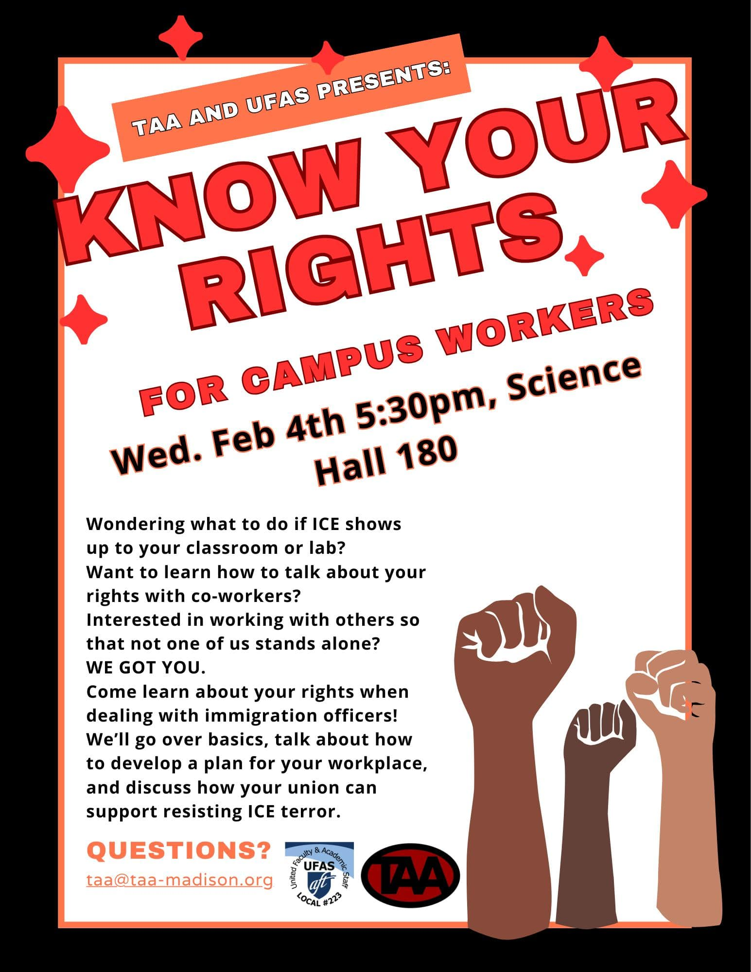 Categories Uncategorized UW Madison, Feb. 4, 2026: TAA AND UFAS – Know Your Rights for Campus Workers! Post author By WiBOPM Post date January 24, 2026 Share this: Share on X (Opens in new window) X Share on Facebook (Opens in new window) Facebook Like Loading... Related ← Milwaukee, January 24, 2026: Stop ICE Terror! → Oshkosh, January 25, 2026: Stop ICE Terror! – Emergency Call to Action!