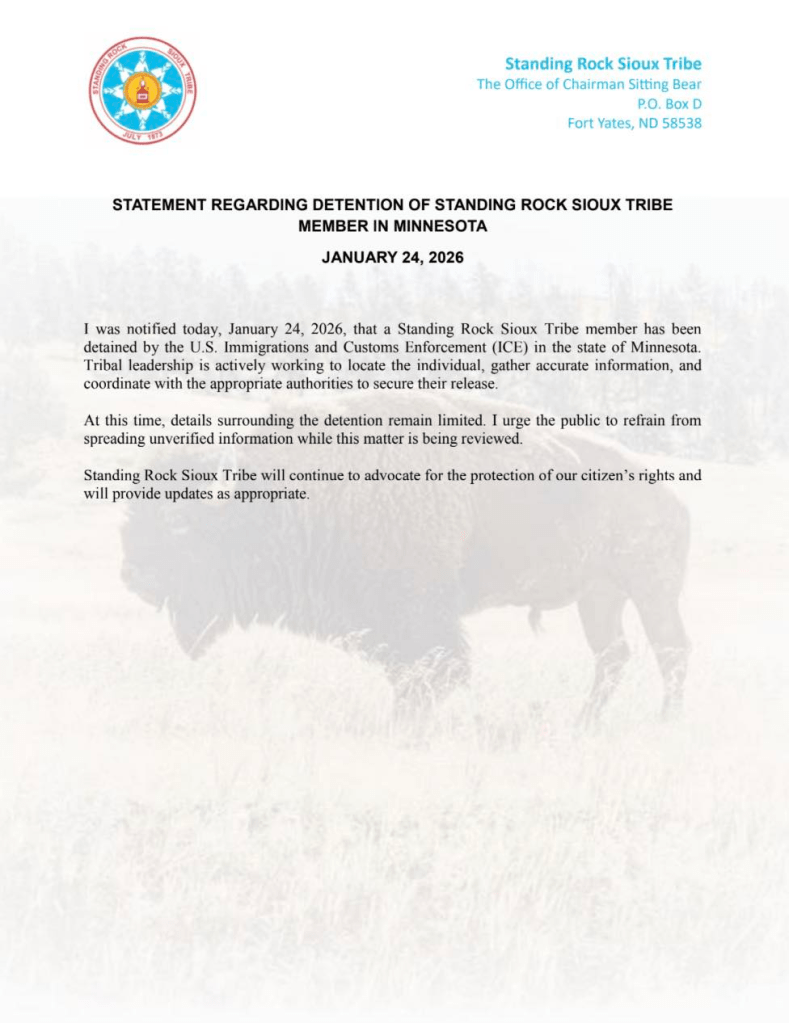 Categories Uncategorized Standing Rock Sioux Tribe: Statement Regarding Detention of Tribe Member in Minnesota by ICE Post author By WiBOPM Post date January 25, 2026 Standing Rock Sioux Tribe Share this: Share on X (Opens in new window) X Share on Facebook (Opens in new window) Facebook Like Loading... Related ← UN Warns of Worst West Bank Crisis Since 1967 – Killings, Displacement, and Settler Violence Escalate → ICE Tracking App