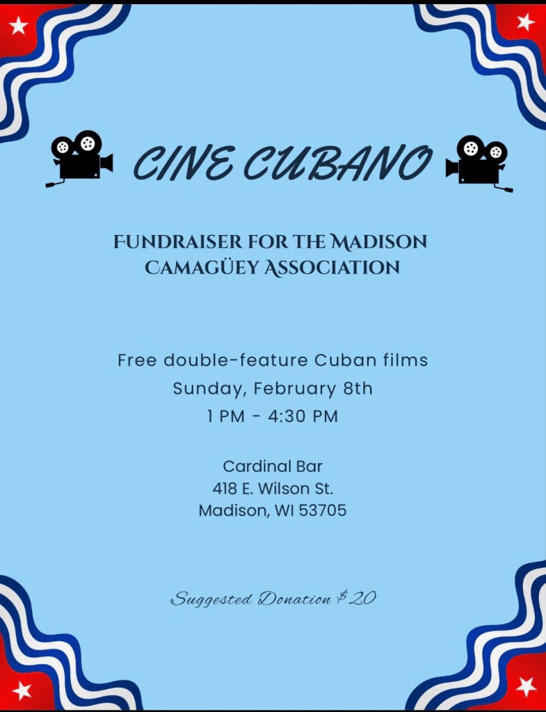 Categories Uncategorized Madison, Feb. 8, 2026: Cine Cubano (Cuban Films) – Fundraiser for Camaguey Association! Post author By WiBOPM Post date January 26, 2026 Madison-Camaguey Sister City Association Share this: Share on X (Opens in new window) X Share on Facebook (Opens in new window) Facebook Like Loading... Related ← AFT Wisconsin Statement About Alex J. Pretti – ICE Out Now!