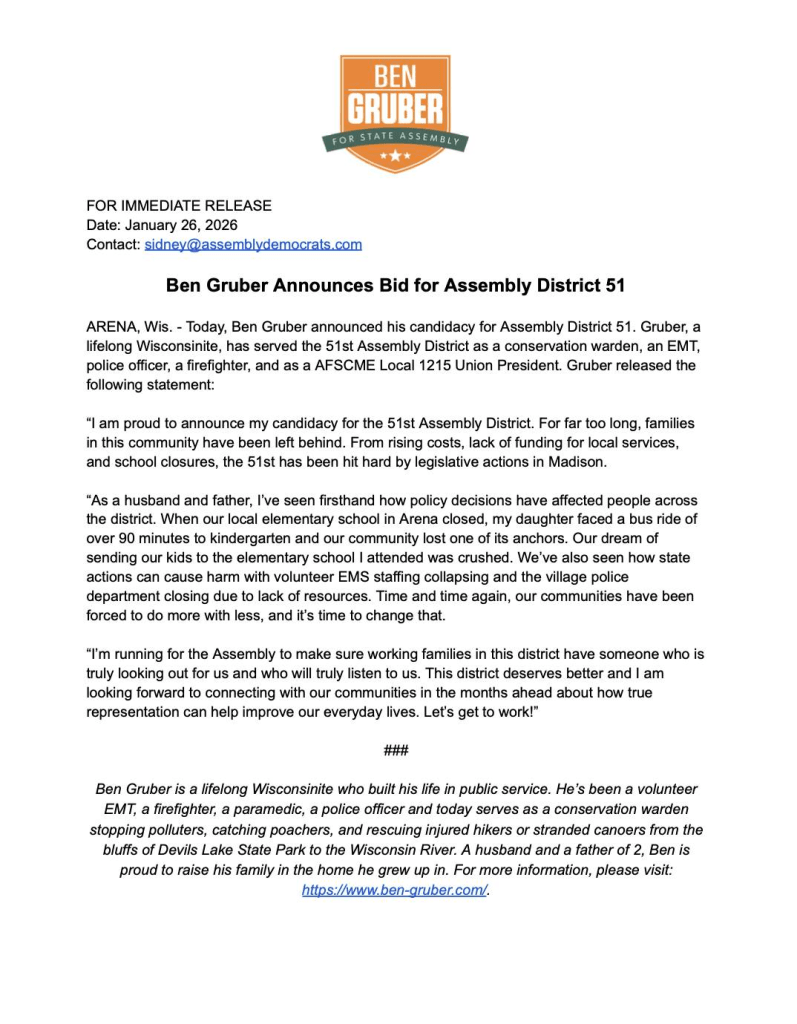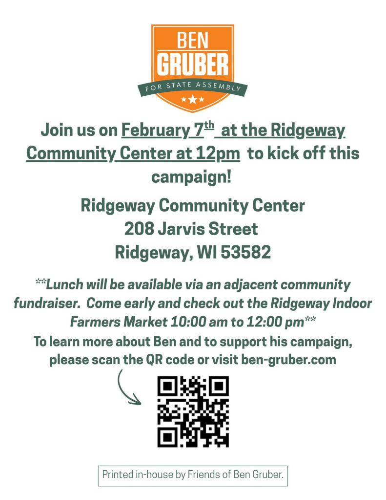 Categories Uncategorized AFSCME Leader Ben Gruber Feb. 7, 2026 Campaign Kickoff in Ridgeway, WI Post author By WiBOPM Post date January 27, 2026 Ben Gruber for Assembly Share this: Share on X (Opens in new window) X Share on Facebook (Opens in new window) Facebook Like Loading... Related ← WI Teachers Union Statement About Alex J. Pretti → Stand With MN! ICE OUT! January 30, 2026, Milwaukee: No Work. No School. No Shopping.
