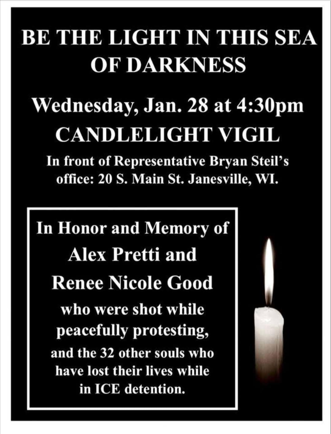 Categories Uncategorized Janesville, WI, January 28, 2026: Candlelight Vigil in Honor of Those Murdered by ICE! Post author By WiBOPM Post date January 27, 2026 Share this: Share on X (Opens in new window) X Share on Facebook (Opens in new window) Facebook Like Loading... Related ← We Rise Fighting! Labor Podcast Episode 128: Report back from Minneapolis General Strike → Lancaster, WI, January 27, 2026: Candles for Courage Vigil – For Those Murdered by ICE!