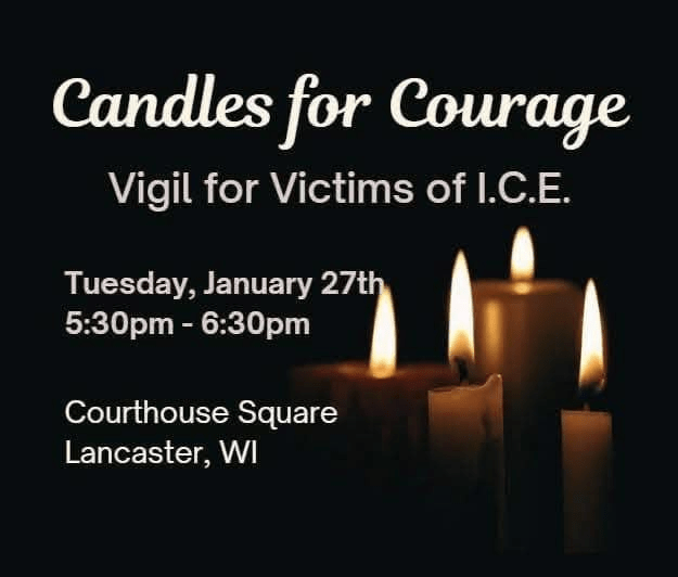 Categories Uncategorized Lancaster, WI, January 27, 2026: Candles for Courage Vigil – For Those Murdered by ICE! Post author By WiBOPM Post date January 27, 2026 Share this: Share on X (Opens in new window) X Share on Facebook (Opens in new window) Facebook Like Loading... Related ← Janesville, WI, January 28, 2026: Candlelight Vigil in Honor of Those Murdered by ICE! → Eau Claire, January 27, 2026: Solidarity With MN! – Stop ICE!