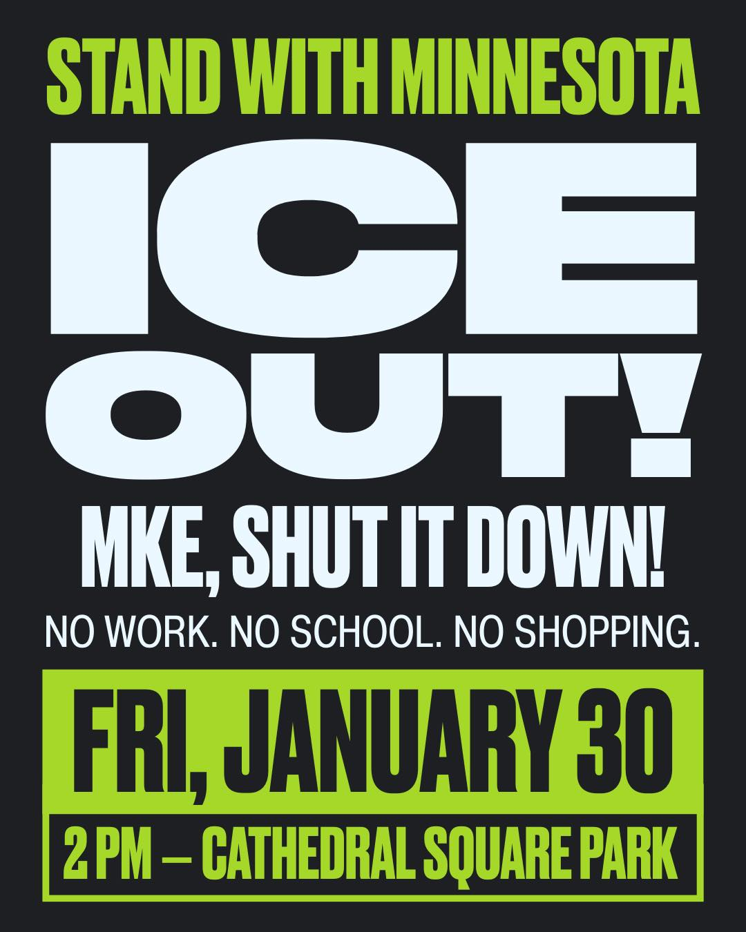 Categories Uncategorized Stand With MN! ICE OUT! January 30, 2026, Milwaukee: No Work. No School. No Shopping. Post author By WiBOPM Post date January 28, 2026 Share this: Share on X (Opens in new window) X Share on Facebook (Opens in new window) Facebook Like Loading... Related ← AFSCME Leader Ben Gruber Feb. 7, 2026 Campaign Kickoff in Ridgeway, WI → UW Madison, January 30, 2026: Money for Public Education NOT ICE! – A Day of Truth & Freedom Rally!