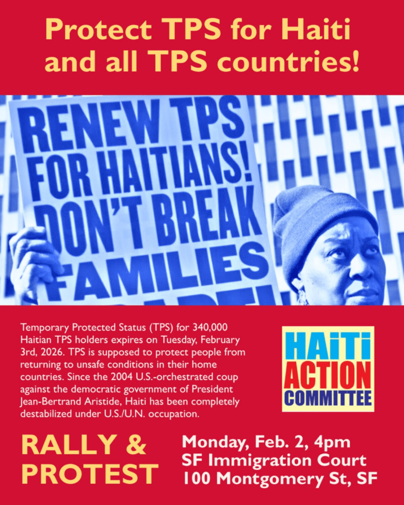| Temporary Protected Status (TPS) for 340,000 Haitian TPS holders expires on Feb. 3rd. It has already been terminated for refugees from Venezuela and Somalia. It is in danger of being terminated for refugees from Myanmar’s repressive military regime, where human rights abuses, sexual violence and conflict-driven displacement are widespread. TPS is supposed to protect people from returning to unsafe conditions in their home countries. Kristi Noem criminally lied when she designated it was safe for Haitians to return to their country even though since the 2004 US-orchestrated coup against the democratic government of President Aristide, Haiti has been completely destabilized under US/UN occupation. In today’s Haiti, paramilitary death squads armed with weapons from the US control large parts of the country, burning, raping and terrorizing the population. Over half the population – 5.7 million Haitians – are facing acute food insecurity; 1.4 million are internally displaced due to violence. This is the situation Donald Trump and Kristi Noem want to force hundreds of thousands of Haitians to return to. Ending TPS for refugees from Haiti, Myanmar and others is just as deadly as ICE raids across the US. Lives are on the line! Unless the motion for a stay is granted on Feb. 2nd, Haitian TPS holders will immediately lose their work permits and be subject to deadly ICE raids, detention and deportation. Take Action Now! URGENT ACTION ALERT! THEY ARE COMING FOR HAITIANS! Call the Congressional switchboard, (202) 224-3121. Say your zip code and ask to be connected to your Representative. When you are connected, say “My name is _______, I live in (city/state/zip code). I am calling to urge Representative _____ to co-sponsor House Resolution 965, to extend Temporary Protected Status for Haitians. Please contact Representative Ayanna Pressley’s office to become a co-sponsor. Thank you for your consideration.” Protect TPS for Haiti and all TPS countries End ICE attacks on Migrants! Abolish ICE! Stop the war on Venezuela and all wars for regime change ICE attacks on refugees and ending TPS: same anti-Black, anti-immigrant policies Sponsored by Haiti Action Committee, Myanmar Student Union, NorCal TPS Coalition and Community Liberation Programs |