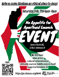 With Madison area DSA. The goal of the No Appetite for Apartheid campaign is to make Madison a more ethical place to shop by removing all grocery items complicit in the violence against Palestinians. “Shop ethically” pledge here.