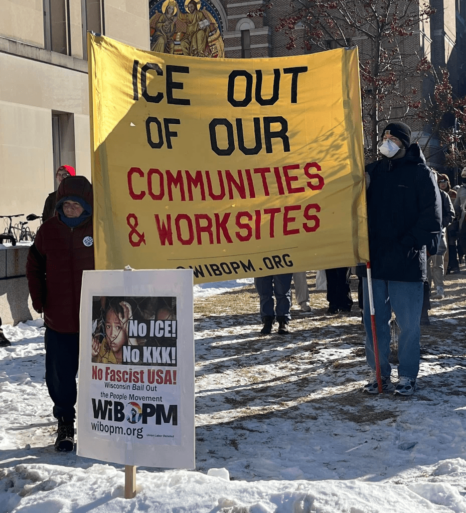 Categories Uncategorized Wisconsin: Stand for Peace! Stop ICE! Free Palestine! U.S.: Hand Off of Iran and Venezuela! (City Listings) Feb. 1-8, 2026 Post author By WiBOPM Post date February 1, 2026 Click here to see a listing and details of recurring vigils across the state. ICE Out protest at UW Madison January 30, 2026.Photo: Wisconsin Bail Out The People Movement Share this: Share on X (Opens in new window) X Share on Facebook (Opens in new window) Facebook Like Loading... Related ← Madison, Feb. 7, 2026: “No Appetite for Apartheid!” → Racine Resists Feb. 2, 2026: ICE Out! Protest