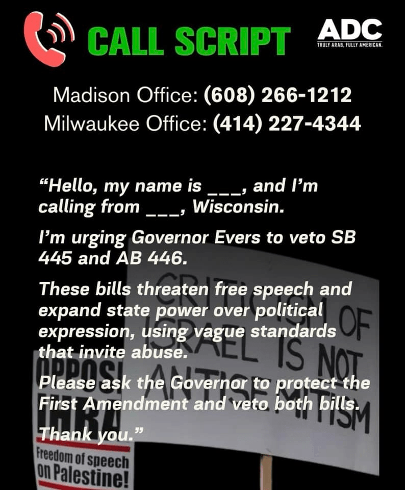 Categories Uncategorized URGENT: Reject IHRA in Wisconsin, Call Officials Today! Post author By WiBOPM Post date February 2, 2026 Share this: Share on X (Opens in new window) X Share on Facebook (Opens in new window) Facebook Like Loading... Related ← Starbucks Workers United Solidarity From Philly to Brazil and Beyond! → Detroit Moratorium Now Meeting Feb. 2, 2026: Black History Month & Bryan G Pfeifer of @wibopm-Report Back from Minnesota