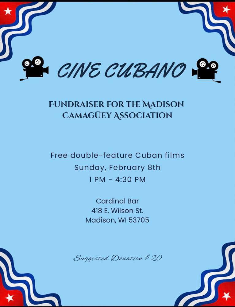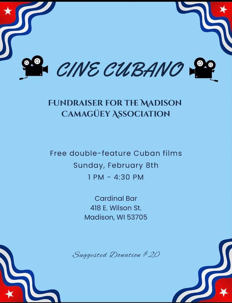 Categories Uncategorized Madison, Feb. 8, 2026: Cine Cubano – Fundraiser for the Madison Camaguey Association! Post author By WiBOPM Post date February 5, 2026 Share this: Share on X (Opens in new window) X Share on Facebook (Opens in new window) Facebook Like Loading... Related ← Madison Senior Center to host Black History Month Festival → Milwaukee, Legal Observer Trainings Feb. 17, 21, 23 and March 7, 2026