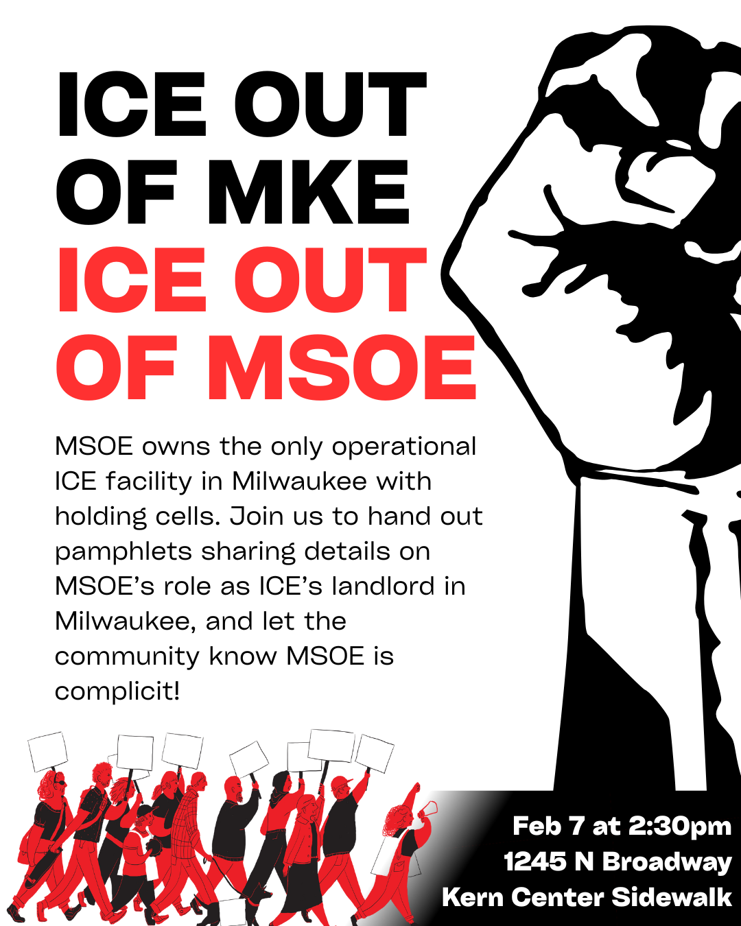 MSOE YDSA regarding MSOE’s Winterfest, taking place on this Saturday, February 7, 2026. We will be flyering outside of the Kern Center to increase awareness around the Knapp Street building and stand in solidarity with immigrant and international students. This is strategic timing as many members of MSOE’s community, including parents and alumni, are going to be concentrated at this location during this time. Come help us get the word out!