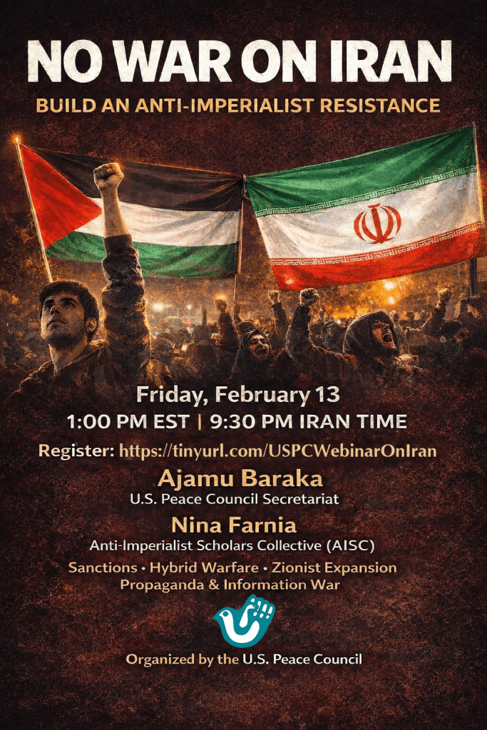 Categories Uncategorized U.S. Peace Council Zoom Webinar Feb. 13, 2026: No War on Iran — Build an Anti-Imperialist Resistance Post author By WiBOPM Post date February 8, 2026 Register: https://tinyurl.com/USPCWebinarOnIran Share this: Share on X (Opens in new window) X Share on Facebook (Opens in new window) Facebook Like Loading... Related ← Milwaukee4Palestine, Feb. 19, 2026: Teach-in: Ban Deadly Exchanges, Stop US Police Terr*r
