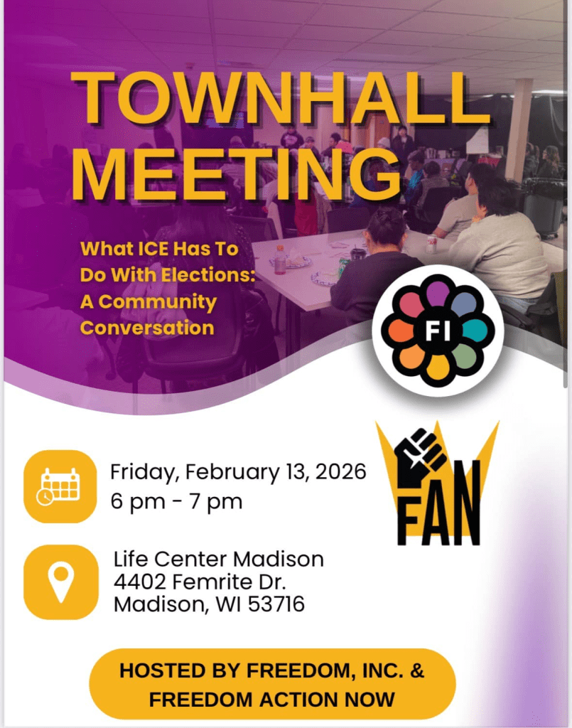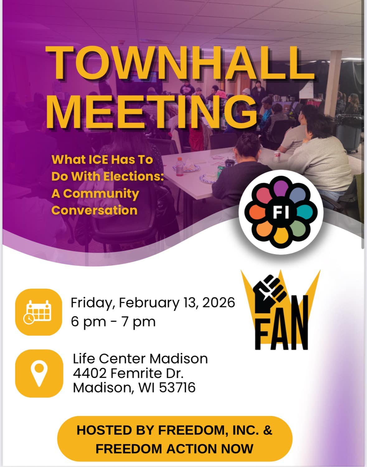 Categories Uncategorized Freedom Inc. Town Hall Meeting in Madison Feb. 13, 2026 Post author By WiBOPM Post date February 9, 2026 Freedom Inc Share this: Share on X (Opens in new window) X Share on Facebook (Opens in new window) Facebook Like Loading... Related ← U.S. Peace Council Zoom Webinar Feb. 13, 2026: No War on Iran — Build an Anti-Imperialist Resistance → Whitewater, WI PRIDE October 3, 2026!
