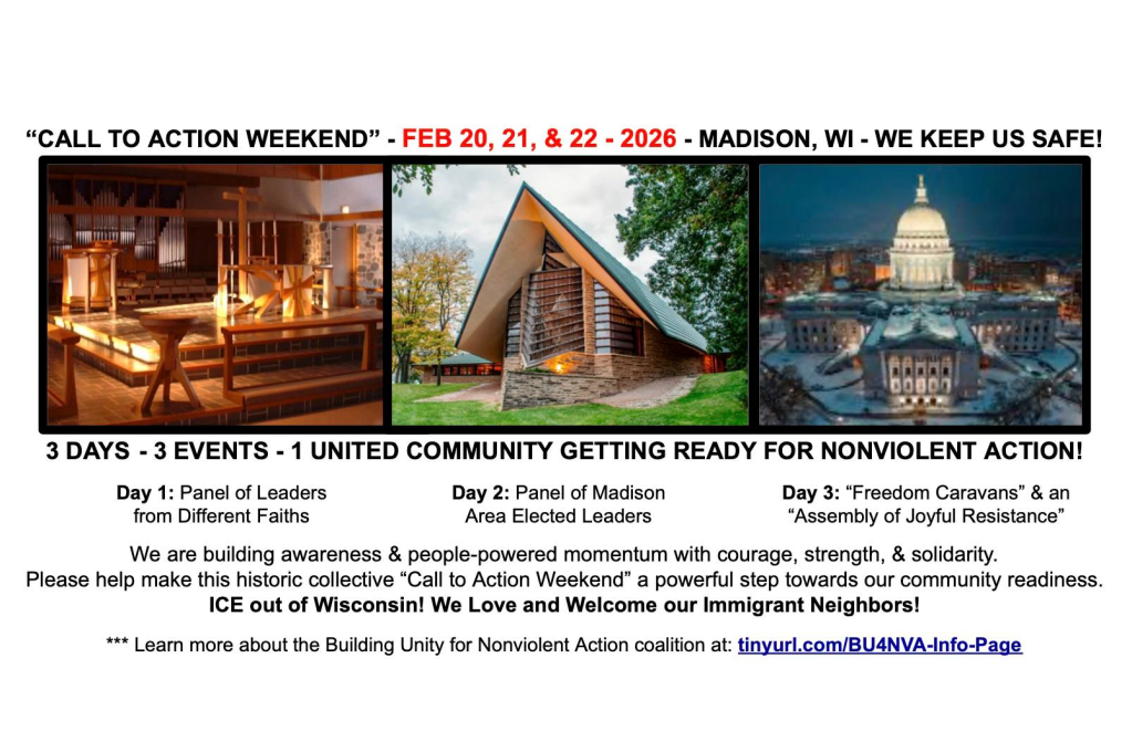 Part 3: Feb. 22, 1-3:45pm – “A New Form of Freedom Rides” and a Capitol Assembly for Nonviolent Action – Communities of faith, conscience, and goodwill, will meet at houses of worship and other locations to form “Freedom Caravans.” Cars in these caravans will display signs calling for protection of our communities and an end to the violence perpetrated by federal agents. They will grow as they move towards the Capitol Square from all corners of Dane County. After circumnavigating the Capitol Square at least once, participants will meet in the Capitol Rotunda for an “Assembly of Joyful Resistance” (~ 2:00 pm)with music, singing, and more.