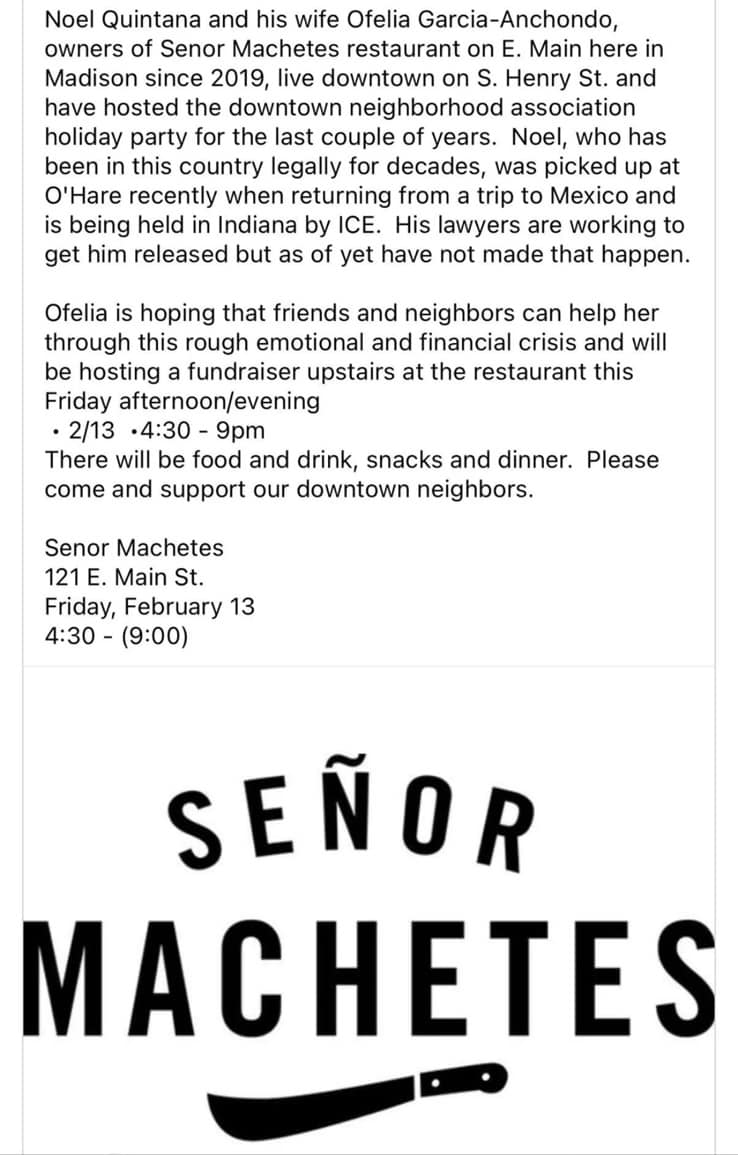 Categories Uncategorized Madison: Support Noel Quintana Co-Owner of Senor Machetes, Kidnapped by ICE! Post author By WiBOPM Post date February 11, 2026 Share this: Share on X (Opens in new window) X Share on Facebook (Opens in new window) Facebook Like Loading... Related ← National Lawyer’s Guild Legal Observer Training at UW Madison Feb. 13, 2026 → National Association of Letter Carriers Nationwide Day of Action Feb. 22, 2026! – Just Contract Now! – Union, Yes, Privatization NO!