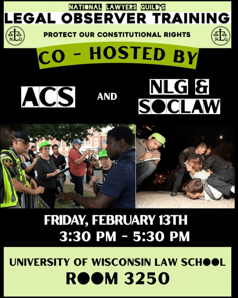 Categories Uncategorized National Lawyer’s Guild Legal Observer Training at UW Madison Feb. 13, 2026 Post author By WiBOPM Post date February 11, 2026 Home Share this: Share on X (Opens in new window) X Share on Facebook (Opens in new window) Facebook Like Loading... Related ← Worker Justice Wisconsin, March 9, 2026: Protect Immigrants at Work Training → Madison: Support Noel Quintana Co-Owner of Senor Machetes, Kidnapped by ICE!