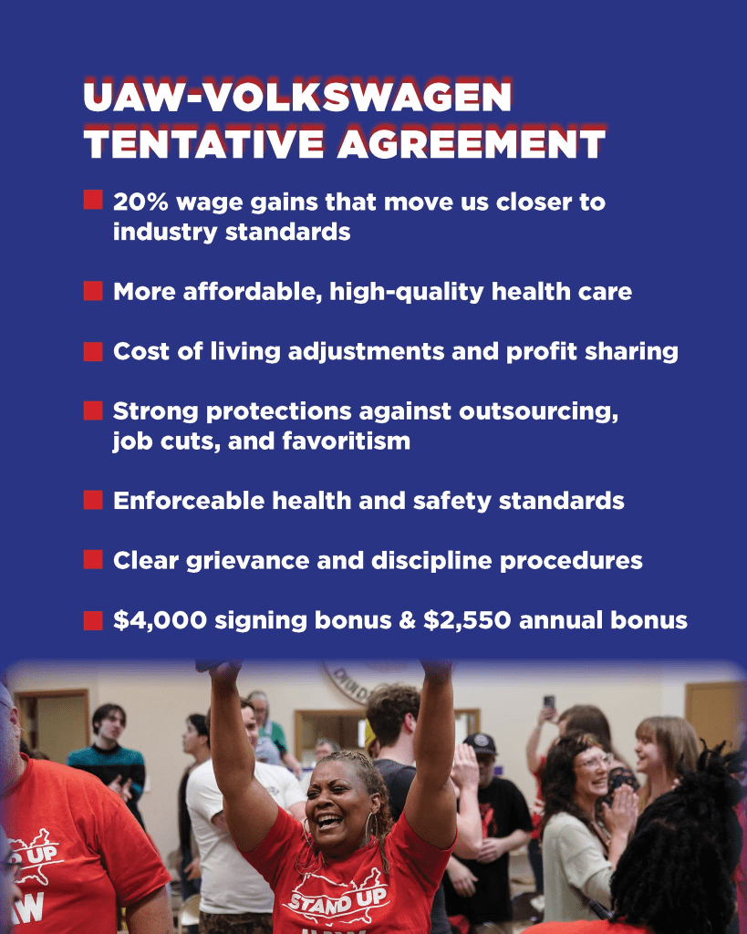 After workers voted 3-to-1 to join the UAW in 2024, they elected a 20-member negotiating committee of their peers. After months of negotiations, the tentative deal marks a breakthrough for non-union autoworkers and manufacturing workers across the South. The tentative deal ensures that Volkswagen workers have a legally binding and enforceable agreement that guarantees fair pay, more affordable health care, safer working conditions, and clear protections against favoritism.