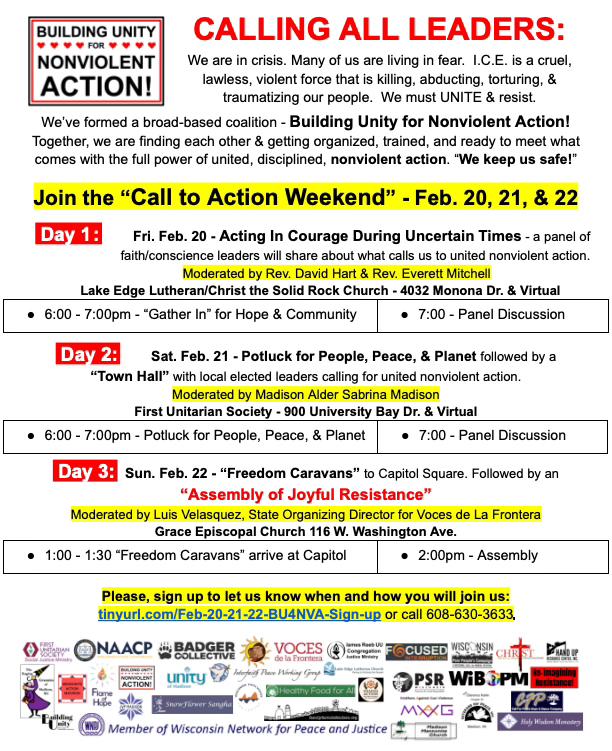 We are pulling together faith, civic, and community leaders of all types and are planning for a big show of unity with a “Call to Action Weekend” – Feb. 20, 21, & 22 – Three events in three days will help bring more volunteers into our coalition’s efforts to get organized to better increase our community’s readiness to meet threats of violence in Wisconsin with NONVIOLENT action.