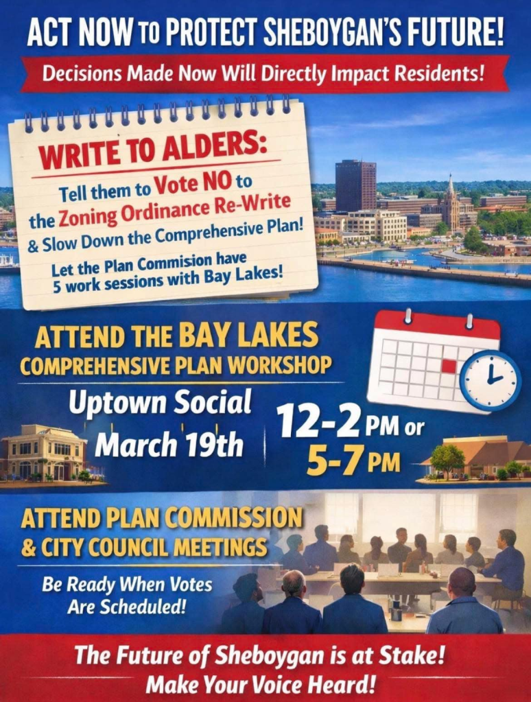 Categories Uncategorized Act Now to Protect Sheboygan’s Future! Contact Alders, Tell Them to Vote NO to Zoning Ordinace Re-Write! Post author By WiBOPM Post date February 22, 2026 Share this: Share on X (Opens in new window) X Share on Facebook (Opens in new window) Facebook Like Loading... Related ← Wisconsin: Stand for Peace! U.S.: Hands Off Iran, Venezuela and Cuba! – People’s Needs Not Endless Wars! → Taycheedah Solidarity Caravan Feb. 23, 2026