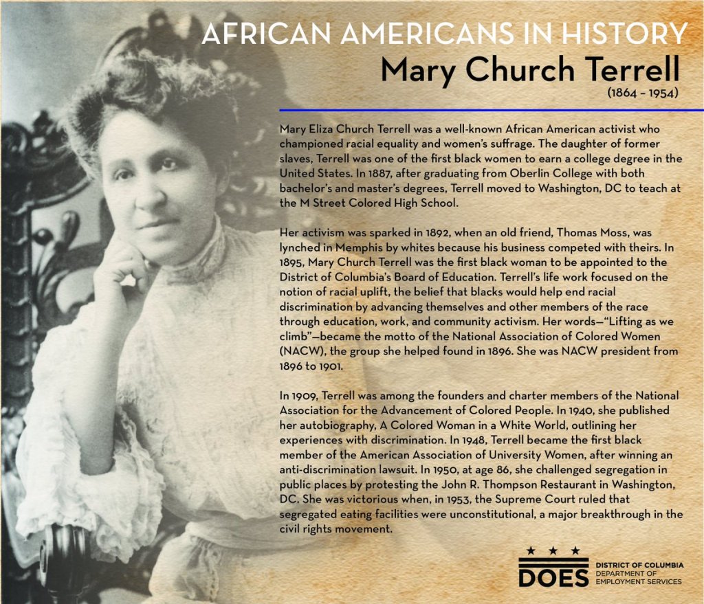 After her marriage to Robert Herberton Terrell, an educator and later attorney and judge, she would continue her career as a teacher and school administrator in Washington, D.C. She was known as a lifelong advocate for African American civil rights in the U.S. Church-Terrell was the founding President of the National Association of Colored Women Clubs (NACW) in 1896 where she campaigned against lynching, racial discrimination and for gender equality.