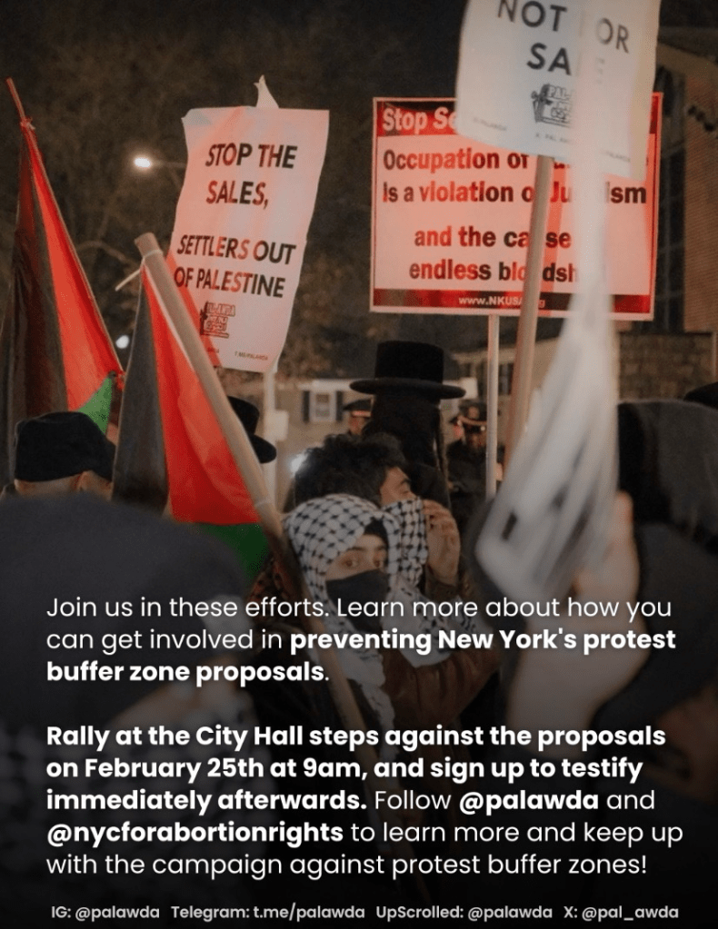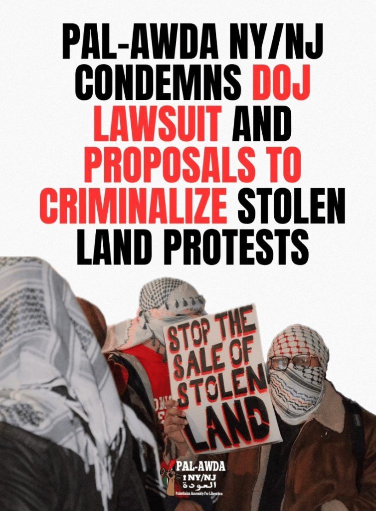 Categories Uncategorized PAL-AWDA NY/NJ Condemns DOJ Lawsuit and Proposals to Criminalize Stolen Land Protests Post author By WiBOPM Post date February 25, 2026 PAL-Awda NY/NJ Share this: Share on X (Opens in new window) X Share on Facebook (Opens in new window) Facebook Like Loading... Related ← Wisconsin: No Kings! No Billionaires! ICE Out! Union, YES! – March 28, 2026 (City Listings)
