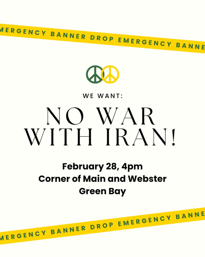Categories Uncategorized Green Bay, Feb. 28, 2026: No U.S. War With Iran! – Money for People’s Needs Not Endless U.S. Wars & ICE! Post author By WiBOPM Post date February 28, 2026 Share this: Share on X (Opens in new window) X Share on Facebook (Opens in new window) Facebook Like Loading... Related ← LIVE BLOG: Iran Launches Crushing Retaliation after Large-Scale US-Israeli Attack → Madison, Feb. 28, 2026 at 3 P.M., State Capitol: NO U.S. WAR WITH IRAN! – MONEY FOR PEOPLE’S NEEDS NOT ENDLESS U.S. WARS & ICE!
