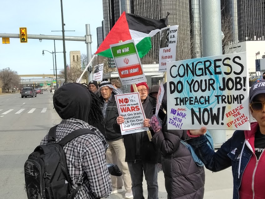 On Sat. Feb. 28, 2026, people gathered at Hart Plaza in downtown Detroit to protest against the United States and Israeli bombing of the Islamic Republic of Iran.