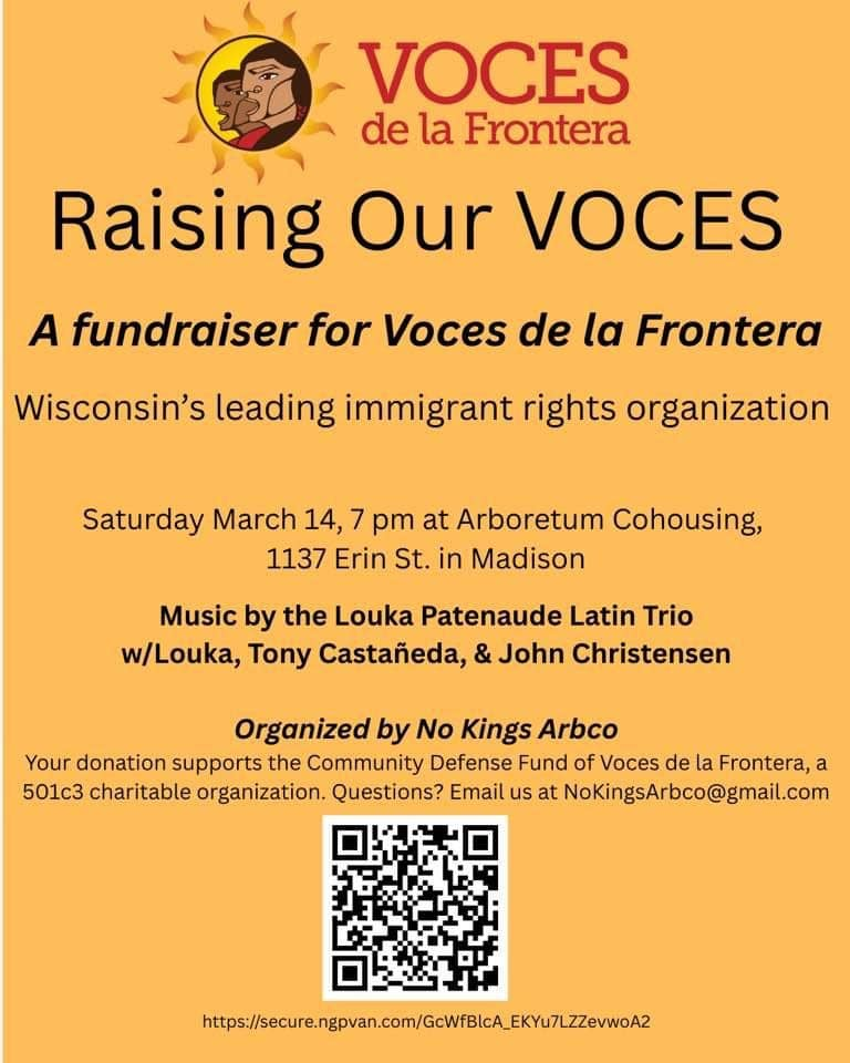 Categories Uncategorized Madison, March 7, 2026: A Fundraiser for Voces de la Frontera Post author By WiBOPM Post date March 1, 2026 Share this: Share on X (Opens in new window) X Share on Facebook (Opens in new window) Facebook Like Loading... Related ← PAL-Awda NY/NJ Condemns DOJ Lawsuit Against Attendees of Stolen Land Protest and the Ongoing Coordinated State Efforts to Criminalize Such Protests → Detroit Demonstration Against the US-Israeli War on Iran