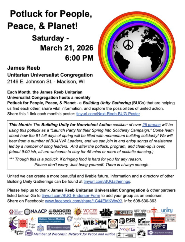 Categories Uncategorized Madison, March 21, 2026: Potluck for People, Peace & Planet Post author By WiBOPM Post date March 4, 2026 Share this: Share on X (Opens in new window) X Share on Facebook (Opens in new window) Facebook Like Loading... Related ← Madison Tenant Power Meeting March 15, 2026 → Madison, March 11, 2026: Voces de la Frontera Know Your Rights Training Session