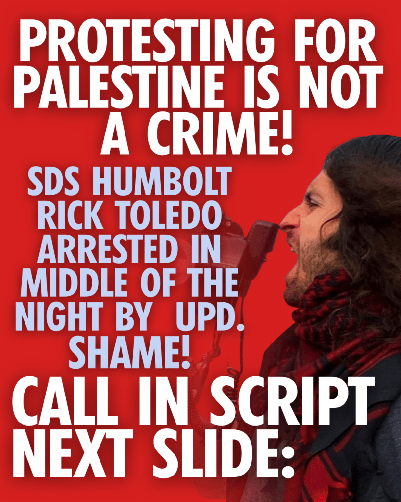 We will keep calling in to demand that Rick Toledo be released immediately and that no charges be filed as a result of the student protest on Feb 27, 2026. We will not stop fighting to defend our right to free speech, to defend our activists from repression, and to free our fellow activists from jail. We will not wait for Tuesday either. If you support the students who protest for Palestine at Cal Poly Tech Humboldt, please call!